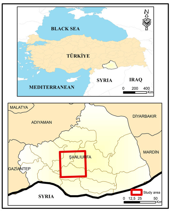 Sanliurfa is located in the Southeastern Anatolia Region of Türkiye. Sanliurfa, located in the Central Euphrates Section of the Southeastern Anatolia Region, is surrounded by Mardin in the east, Diyarbakir in the northeast, Adıyaman in the northwest, Gaziantep in the west, and the Turkey–Syria political border in the south (Figure 1). The Diyarbakir Road, which connects to the Adana highway in the north, connects Syria in the south, Gaziantep in the west, and Mardin in the east. It is extremely important in terms of being located on important transportation routes in the region. The high hills in the north of the province generally decrease towards the south. Large plains are in the south of Sanliurfa. While the elevation in the northern parts is around 800 m, it approaches 2000 m around Karacadağ in the northeast. It drops below 400 m in the plain area in the south. Elevation values increase from south to north and from west to east.