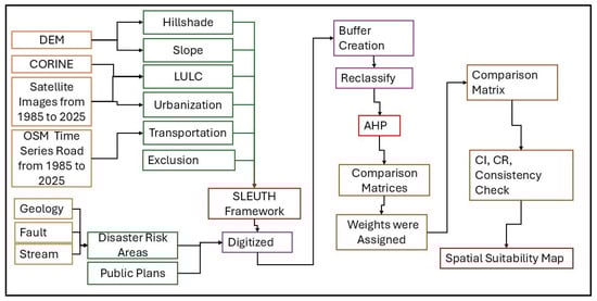 The urbanization simulation outputs obtained with the SLEUTH model and the criteria weights determined by AHP were overlaid with integration in the GIS environment. Each raster cell was assigned a total suitability score calculated with the relevant criteria weights. As a result of this process, a spatial suitability map classified according to the suitability levels for urban development was produced. The suitability map was categorized as low, medium, and high suitability levels and made interpretable. The workflow diagram of the study is given in Figure 2.