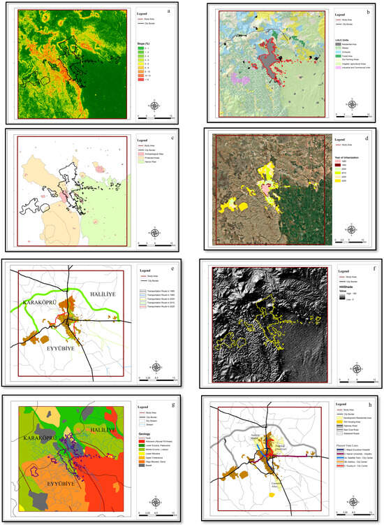 SLEUTH is a model that simulates urban growth and surrounding LULC changes. A set of initial conditions and a growth cycle are developed for the simulation. Once these conditions are determined, a growth cycle, which is the basic unit of the SLEUTH model, is created [33]. The model requires at least four urban layers of different periods, two separate transportation layers, and LULC, as well as a slope layer, a hill shade layer, and an excluded layer. In addition, disaster risk areas and public planning layers that will affect the development direction of the city were used as input layers in this study. All input layers were converted to raster format by assigning AHP values at the same urban coverage, resolution, and geographic coordinates. The data used in this study are shown in Figure 3.