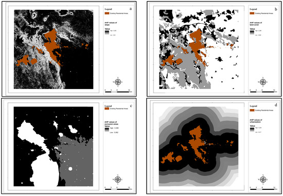 Other important criteria determining the direction of urbanization are urbanization, transportation, disaster risk, and public planning. Areas located 2 km away from the existing urbanization have the highest suitability degree, with an AHP value of 0.235; this situation shows that areas close to the city center are more open to development. Similarly, the transportation criterion was evaluated, and it was determined that areas 500 m away from highways were the most preferred areas, with an AHP value of 0.378. The fact that the geological units in the lowest risk group have a very high AHP value of 0.724 shows that a security-oriented approach is adopted in planning. The fact that the planned housing areas and planned tram lines in the public planning layer that will affect the development direction of the city have an AHP weight of 0.321 each reveals that public investments are effective in determining the direction of urbanization. When all these data are brought together, it is concluded that the SLEUTH model offers a comprehensive spatial planning tool supported by multi-criteria decision analysis. All input data were converted to vector data in the GIS environment, and the data were classified. In the next stage, the AHP comparison matrix was created, and the AHP weight value was determined. The determined values were processed in vector data form, and the spatial distribution maps of the AHP weight value of each data were created in raster format. The spatial distribution maps of the AHP weight value of the input data are given in Figure 4. The comparison matrices of the input data and the AHP weight value Supplementary Materials are given.