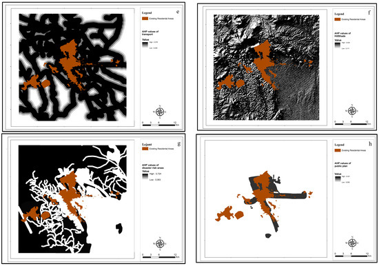 Input layer AHP weight value spatial distribution maps. (a) Slope. (b) LULC. (c) Excluded. (d) Urbanization. (e) Transportation. (f) Hill shade. (g) Disaster risk areas. (h) Public plans.