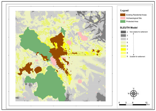 The result map was created using the Weighted Overlay tool, which reclassified all input parameters between 1 and 9 (Figure 5). The spatial suitability map obtained in the study revealed the geographical distribution of the settlement suitability values defined by the SLEUTH model in the range of 1–9. In the areas around the existing urban core, the values correspond to the range of 7–9, representing the highest suitability level. This high suitability zone overlaps with the main transportation corridors of the city, especially in the east–west direction, confirming that the positive effect of infrastructure networks on settlement directs spatial expansion. Medium suitability zones (5–6) are concentrated in areas relatively far from the city center, where the topographic slope is moderate, and offer potential in gradual growth strategies despite infrastructure deficiencies. In contrast, low suitability areas in the range of 2–4 are concentrated in high-slope, forest areas, agricultural lands, and steppe ecosystems in the northeast and southeast directions; it has also been determined that protected areas are unsuitable for settlement.