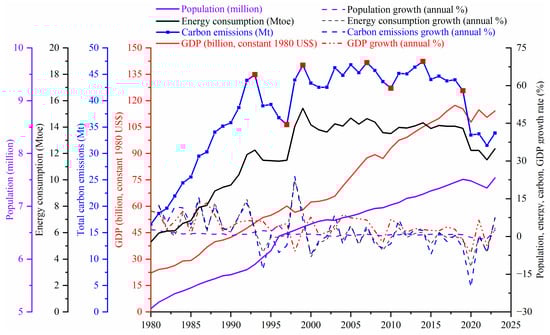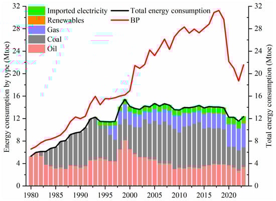 Regarding the research on carbon emissions in Hong Kong, most studies rely on international databases or research reports [87,88], which may lead to certain discrepancies in data sources. In this study, the data sources primarily include the “Hong Kong Annual Digest of Statistics”, “Hong Kong Energy Statistics Annual Report”, and the “Hong Kong Energy Statistics” issued by the Census and Statistics Department of the Hong Kong Special Administrative Region and the “Hong Kong Energy End Use Data” provided by the Electrical and Mechanical Services Department of the Hong Kong Special Administrative Region, as well as relevant research reports from the Development Bureau of the Hong Kong Special Administrative Region. The energy consumption data spanning from 1980 to 2023 were extracted from the above materials. The total energy consumption data encompass coal, oil, natural gas, renewable energy, and imported electricity, with the unit being millions of tons of oil equivalent (Mtoe). Population size and economic aggregate data were sourced from the “Hong Kong Annual Digest of Statistics”. Additionally, for comparative purposes, total energy consumption from BP (https://www.bp.com (accessed on 8 May 2025)), population size, and GDP data from the World Bank’s WDI database (http://datatopics.worldbank.org/world-development-indicators (accessed on 8 May 2025)) were utilized. The population size was measured in units of thousands, while the economic aggregate data were converted based on 1980 USD, with the unit being billion dollars. Through the application of the selected decomposition model, a yearly analysis was conducted to identify the driving factors influencing carbon emissions in Hong Kong. Therefore, all economic-related data should be adjusted to constant prices in order to accurately analyze annual change trends. This study utilized GDP data (constant 1980 USD) based on official current GDP data from the World Bank to enhance the credibility and authority of the findings.