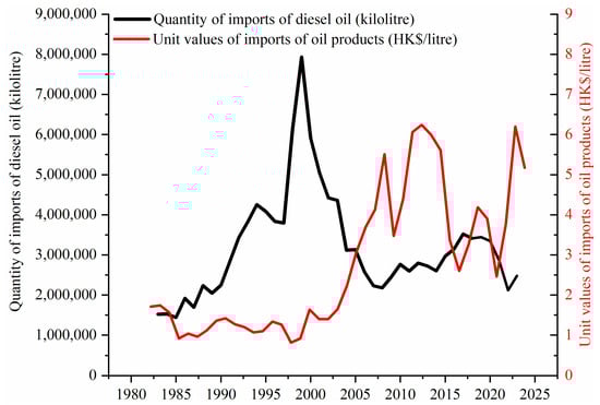 As illustrated in Figure 1, the energy consumption in Hong Kong has primarily consisted of coal and diesel. The share of coal consumption increased from 12.55% in 1982 to 61.55% in 1993, followed by fluctuations and a decline to 24.21% in 1999. Subsequently, the proportion of coal consumption rose again from 24.21% in 1999 to 56.85% in 2014, before experiencing further fluctuations and decreasing to 28.47% in 2023. The proportion of oil consumption exhibited fluctuations and declined from nearly 100% in 1980 to 53.02% in 1999, followed by a further decrease to 27.28% in 2023. Oil consumption is significantly influenced by variations in oil prices. Taking diesel as an example (as shown in Figure 2), the trend of diesel consumption in Hong Kong demonstrates an inverse relationship with changes in diesel prices. Specifically, diesel consumption tends to decrease when prices rise and increase when prices fall. The consumption of natural gas and imported electricity has exhibited a consistent upward trend. The proportion of natural gas consumption increased from 0.23% in 1995 to 19.48% in 2019, and subsequently surged to 34.54% in 2023. Similarly, the proportion of purchased electricity consumption steadily rose from 0.31% in 1993 to 8.07% in 2023. In 1995, natural gas was incorporated into the energy consumption mix as a substitute for a portion of coal-fired power generation. Between 1995 and 1999, there was a noticeable decline in coal usage. The first gas-fired power generation unit was established in Hong Kong in 1996. Since then, the average share of natural gas in the energy consumption structure has remained at approximately 17%. Hong Kong began to increase the use of imported electricity in 1993. The Daya Bay Nuclear Power Plant in Shenzhen started operation in 1993. Energy consumption in 1993 and beyond included electricity imported from the Chinese mainland (Figure 3). The Daya Bay Nuclear Power Plant is jointly developed and operated by Guangdong Nuclear Power Investment Co., Ltd. and Hong Kong Nuclear Power Investment Co., Ltd. The Daya Bay Nuclear Power Plant, as the first large-scale commercial nuclear power plant on the Chinese mainland, supplies 70% of the electricity it generates to Hong Kong, accounting for approximately one quarter of its social electricity consumption. In 2015, 80% of the electricity generated by the Daya Bay Nuclear Power Plant was transmitted to Hong Kong. Following this, the power generation capacity of local power plants progressively diminished, leading to an increased import of electricity from the Chinese mainland and a corresponding reduction in coal consumption in Hong Kong. Since 2006, wind power generation has been integrated into the local energy supply system. Renewable energy sources primarily comprise biomass energy, photovoltaic power, and wind power in Hong Kong.