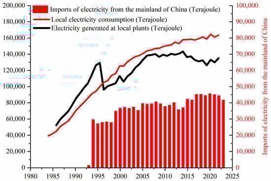 Local electricity consumption and electricity generated at local plants and imports of electricity during 1980–2023.