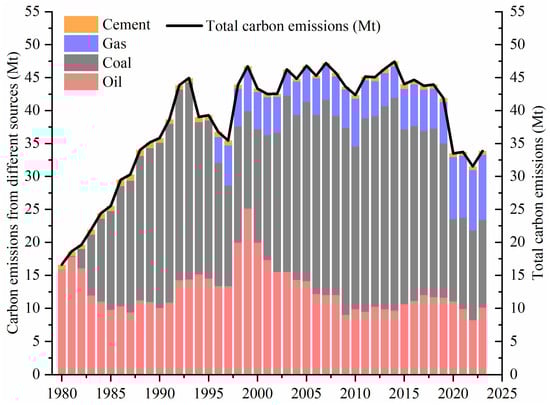 Total carbon emissions and carbon emissions from different sources from 1980 to 2023 in Hong Kong.