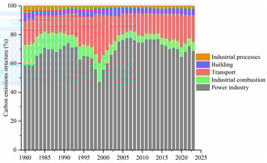 It can be observed from Figure 5 that carbon emissions in Hong Kong are primarily attributed to the power industry and transportation, which account for average proportions of 68.7% and 17.1%, respectively. The contribution of buildings to carbon emissions remains relatively stable at approximately 4.1%. Meanwhile, the proportion of industrial combustion in carbon emissions exhibits a fluctuating downward trend.