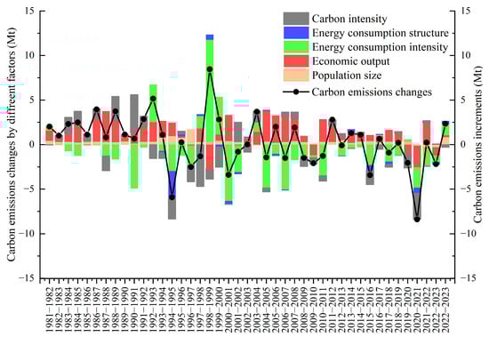 The contribution effects of population size (), economic output (), energy intensity (), energy structure (), and carbon intensity () were quantitatively analyzed across different years from 1980 to 2023 (Figure 6). Economic output serves as one of the primary factors driving the growth of carbon emissions in Hong Kong, whereas energy intensity acts as a key factor in restraining this growth.