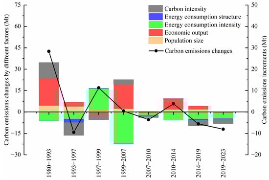 Between 1980 and 2023, Hong Kong’s carbon emissions underwent a phase of rapid increase, followed by stabilization, and eventually a decline. Coal consumption constituted the primary source of carbon emissions in Hong Kong. This study employed the Kaya identity and the LMDI factor decomposition model to quantitatively analyze the impact of multiple factors on carbon emissions in Hong Kong from 1980 to 2023, yielding the following primary conclusions: (1) Economic output emerged as the predominant factor driving the increase in carbon emissions in Hong Kong. Its contribution varied across different stages of development. Given the vulnerability of Hong Kong’s economy to external factors and its inherent volatility, as the economic growth rate gradually decelerated, the influence of the economic output effect also diminished accordingly. The population size effect served as a significant driver of carbon emission growth, second only to the economic output effect. Its impact on carbon emissions at various stages remained relatively stable. (2) The energy consumption intensity effect played a crucial role in mitigating the growth of carbon emissions in Hong Kong, largely counterbalancing the emissions induced by economic growth. Energy consumption intensity is closely linked to economic development and exhibits substantial fluctuations across different stages. In the third stage, it demonstrated a positive effect, primarily due to the repercussions of the Asian financial crisis, which led to negative GDP growth while energy consumption surged rapidly. Conversely, the remaining seven stages all exhibited negative effects, with the fourth stage achieving the most pronounced emission reduction outcome. (3) The energy consumption structure effect performed a restraining effect on carbon emissions in Hong Kong. Its influence varied at different stages and was relatively small. The main reason was that the change in the use of clean energy in Hong Kong was relatively small. Hong Kong began to import nuclear power from the Chinese mainland in the second stage, and the emission reduction effect of the energy consumption structure effect gradually emerged and remained stable. (4) The carbon intensity effect generally played a role in restraining the growth of carbon emissions. Its degree of influence at different times was affected by the change in coal consumption. In the first, fourth, and sixth stages, due to the increase in coal consumption, the carbon intensity effect played a role in increasing emissions. In the second, third, fifth, seventh, and eighth stages, coal consumption decreased, and the carbon intensity effect played a role in reducing emissions. Overall, the carbon intensity effect had a relatively weak negative effect.
