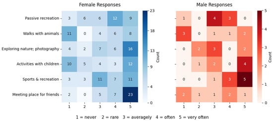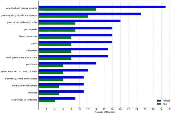 - Bąkowska-Waldmann, E.; Piniarski, W. Gender-specific preferences regarding urban green areas. Quaest. Geogr. 2023, 42, 23–41. [Google Scholar] [CrossRef]