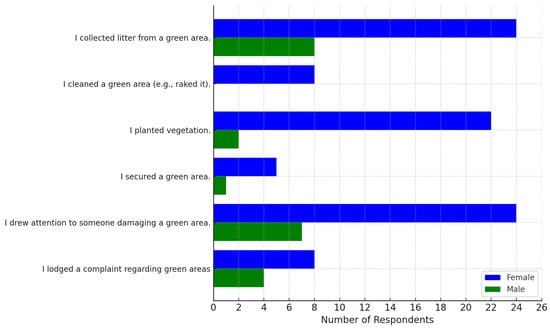 - The majority of respondents acknowledge the positive role of urban greenery and nature-based solutions and express a sense of responsibility for green spaces. Nevertheless, they demonstrate limited willingness to take the initiative or express uncertainty regarding what actions they could personally undertake. This may reflect concerns about the long-term maintenance of such interventions;