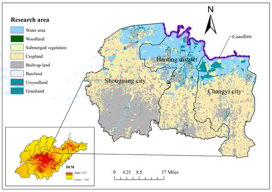 The research area is located in the coastal city in the north of Weifang City, Shandong Province, which includes three administrative regions: Shouguang City, Hanting District, and Changyi City, with a total area of 4615.62 km2, as shown in Figure 1. It is connected with Qingdao and Yantai in the east, Zibo and Dongying in the west, Linyi and Rizhao in the south, and the Bohai Sea in the north. It spans from 118°59′ E to 120°01′ E in longitude and from 36°25′ N to 37°22′ N in latitude. The research area presents a trend of higher elevation in the south and lower elevation in the north, transitioning from hills in the south to alluvial plains in the north. It belongs to the warm temperate continental monsoon climate zone. There are Weihe River, Mi River, Bailang River and other rivers distributed in the research area, which flow into Laizhou Bay of Bohai Sea from south to north.