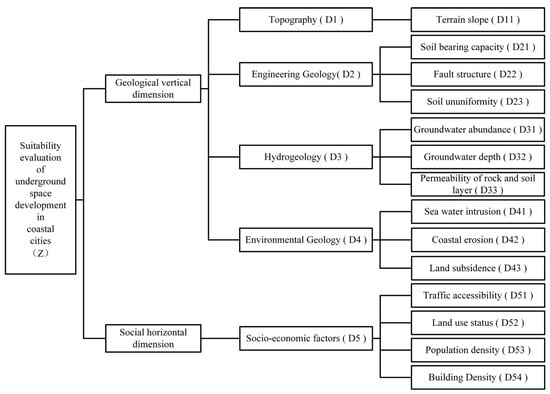 Taking the suitability of underground space development of coastal cities as the target layer of the evaluation system, the criterion layer of the evaluation system is constructed considering five aspects: engineering geology, hydrogeology, environmental geology, topography and landform, social economy. Then, taking into account both the vertical geological dimension and the horizontal social dimension, the evaluation system’s indicator layer is further composed of 14 indicators: topographic slope, fracture structure, soil ununiformity, soil bearing capacity, groundwater abundance, groundwater level depth, permeability of rock and soil layers, seawater intrusion, land subsidence, coastal erosion, traffic accessibility, land use status, population density, and building density. The three-dimensional evaluation indicator system finally constructed is shown in Figure 2.