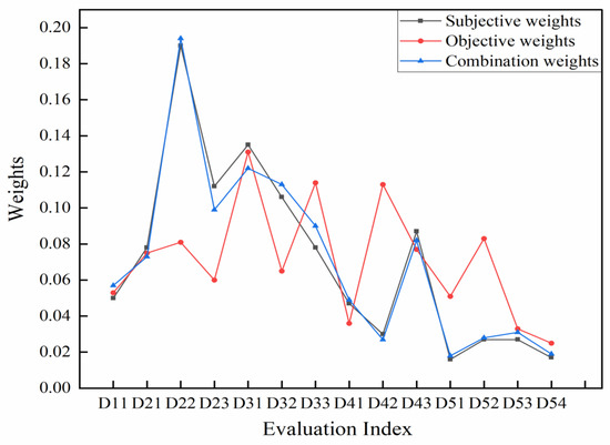 The combined subjective and objective weight of the evaluation indicator system.