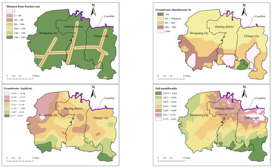 Regarding the evaluation indicator of groundwater level, based on the groundwater level within 60 m below the ground surface in June 2016, an obvious groundwater funnel is observed at the junction of Yingli Town, Taitou Town, and Shuangwangcheng Ecological Economic Park Management Committee in Shouguang City, with the maximum water level reaching over −80 m. Meanwhile, groundwater funnels are also present in Dajiawa Subdistrict, Yangzi Subdistrict, and Gudi Subdistrict of Hanting District, with water table depths ranging approximately from −20 m to −30 m. Additionally, a small-scale groundwater depression cone is observed near Kuiju Subdistrict in Changyi City, where the water table depth similarly ranges from approximately −20 m to −30 m. Weighted processing is conducted on the ununiformity of soil types within a 20 m depth range of geological drill holes in the research area. The richer the variety of soil types, the higher the value, indicating greater non-uniformity. As shown in the figure, the soil ununiformity in the coastal area of the research zone is relatively high, and the soil types are quite diverse. These areas are predominantly distributed with medium-coarse sand, silt, and silty clay formed by Quaternary alluvial–proluvial processes, as well as silty-fine sand, loamy sand, and loam formed by alluvial-marine deposition. In the southeast of the research area, the types of soil masses are relatively simple, mainly distributed as sandy soil and rock types.