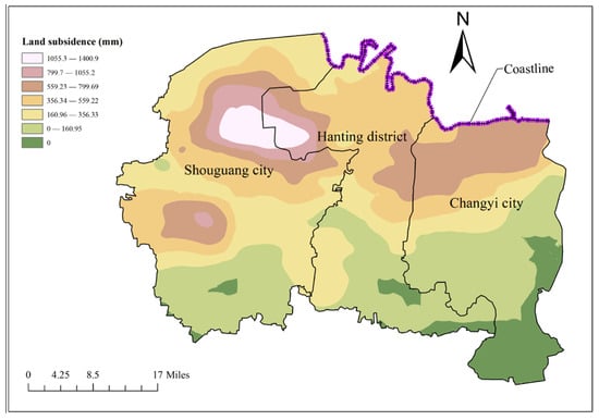 The suitability of underground space development in coastal cities is divided into five grades: very suitable, more suitable, general suitable, less suitable and unsuitable. The research area is divided into 2063 evaluation units with the size of 1.5 km × 1.5 km, and the fuzzy mathematics comprehensive evaluation is carried out by using the above evaluation methods. Formulas (11)–(13) are used to establish the membership function of all evaluation indexes. Among them, taking the land subsidence as an example, the cumulative land subsidence in the research area from 2006 to 2021 is shown in Figure 5. As can be seen from the figure, there is a land subsidence funnel at the junction of Yangjiazhuangzi Village in Yingli Town, Shouguang City and Dajiawa Subdistrict, Hanting District, with an area of 471.52 km2. The subsidence center is located in Yangjiazhuangzi Village, Yingli Town, Shouguang City, and the cumulative subsidence from 2006 to 2021 is 1469 mm. Meanwhile, there is another small land subsidence funnel near Caojiazhuang Village, Wenjia Subdistrict, Shouguang City, with a cumulative subsidence of 874 mm. In addition, there is also a land subsidence zone in the area from Cuijiayangzi Village to Dongxiaying Town at the junction of Hanting District and Changyi City, with an area of 310.22 km2. The subsidence center is located in Cuijiayangzi Village, and the cumulative subsidence amount is 847 mm. Overall, the land subsidence trend in the research area gradually weakens from north to south.
