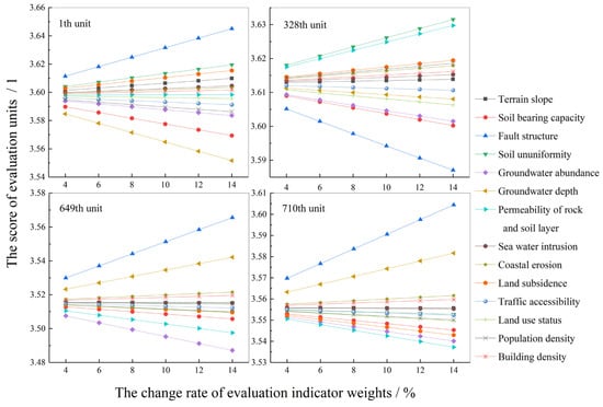 To analyze the impact of changes in the weights of different evaluation indicators on the overall evaluation results, four evaluation units with numbered 1, 328, 649, and 710 are randomly selected from all the evaluation units. The sensitivity analyses of the indicator weights are carried out using the improved fuzzy comprehensive evaluation method mentioned above, and the results are shown in Figure 6. Analysis shows that as the weights of the indicators increase, different units exhibit similar patterns of change, that is, the evaluation scores increase linearly along with the increase in the weight of the indicators. This is because when the weight of a single indicator increases, the total weight must remain at 1, which leads to a consistent rate of change for all indicators. Meanwhile, the absolute values of the slopes in each indicator reflect their sensitivity to the results. It can be seen that the several indicators with higher sensitivity are fault structure, groundwater depth, groundwater abundance, and soil ununiformity, which are generally consistent with the calculation results of the combined weights. Furthermore, the final evaluation results of the 4 evaluation units remained within the range of original evaluation grade and did not change with the increase in the weight of the indicators, indicating the scientificity and stability of the combined weighting methods proposed.