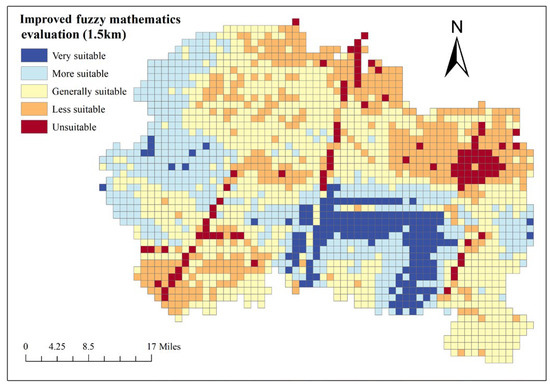The same methods are used to calculate all other evaluation units, and the improved fuzzy comprehensive evaluation scores of all units are visualized on the ArcGIS platform. The evaluation result is obtained as shown in Figure 7.