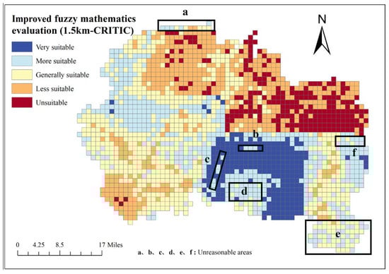 To clarify the impact of different weighting methods on the final evaluation results, the evaluation results based on the CIRTIC objective weighting method are compared and analyzed, as shown in Figure 8. Analysis shows that the area marked as “a” in the figure is approximately 22.5 km2, located near Yangkou Beach in the coastal area of the Bohai Sea. Compared to the inland areas, this region has environmental geological problems such as coastal erosion, seawater intrusion, and uneven soil quality. Moreover, this area has a relatively sparse population and few buildings, with a large amount of water bodies. However, the evaluation results of many units are “More suitable”, which are obviously unreasonable when compared with the actual situation. The areas marked as “b” and “c” in the figure are located at the center of the fault zones in the Hengli Road-Hebei Lingzi Village and Lijiatai Village-Yangjiawuzi Village, respectively, with areas of 11.25 km2 and 24.75 km2. However, the zoning results obtained through objective calculations are “Very suitable” or “More suitable”, which are obviously unreasonable.