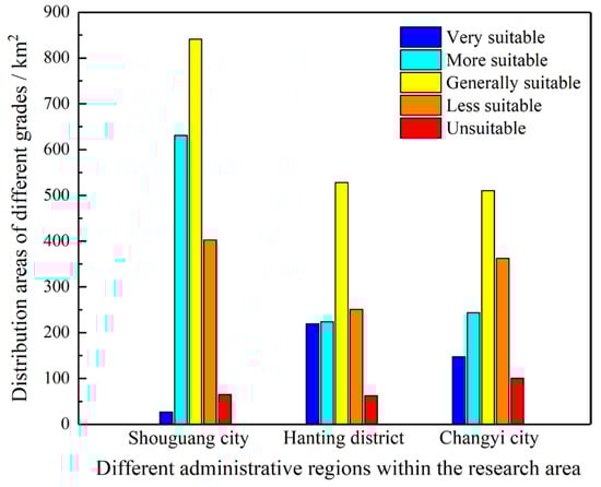 To further analyze the suitability of underground space development in different administrative regions, the land areas of different suitability grades for underground space development in three administrative regions are extracted, as shown in Figure 9. It can be seen that the suitability of underground space development in the three administrative regions all follow a normal distribution law. Generally, the areas with general suitability for underground space development are the largest, while the areas with very high suitability and those with unsuitability are relatively the small. Among them, the areas that are very suitable and more suitable for underground space development in Shouguang City are 26.85 km2 and 630.93 km2, respectively, and the less suitable and unsuitable areas are 402.72 km2 and 64.88 km2, respectively. The areas that are very suitable and more suitable for underground space development in Hanting District are 219.26 km2 and 223.73 km2, respectively, and the less suitable and unsuitable areas are 250.58 km2 and 62.65 km2, respectively. The areas that are very suitable and more suitable for underground space development in Changyi City are 147.66 km2 and 243.87 km2, respectively, and the less suitable and unsuitable areas are 362.45 km2 and 100.68 km2, respectively.
