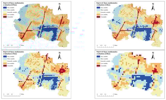 The evaluation results obtained above are based on the grid division with evaluation units of 1.5 km × 1.5 km, and the size of the evaluation units may have an impact on the evaluation results of the study area. Therefore, the evaluation units are further divided into other three cases: 0.5 km × 0.5 km, 1.0 km × 1.0 km and 2.0 km × 2.0 km, and the evaluation results under different cases are calculated and compared based on the aforementioned evaluation methods and processes. Figure 10 shows the comparison of evaluation results in four cases where the evaluation grid units are 0.5 km × 0.5 km, 1.0 km × 1.0 km, 1.5 km × 1.5 km and 2.0 km × 2.0 km, respectively.