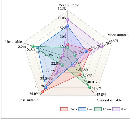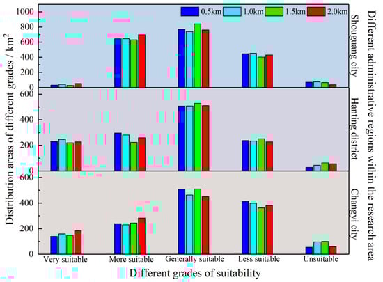 To analyze the influence of grid unit size on the evaluation results, the areas of different evaluation levels in four different cases are extracted, as shown in Figure 11. The results show that in the evaluation model with the grid unit size of 0.5 km × 0.5 km, the areas of very suitable, more suitable, generally suitable, less suitable and unsuitable are 400.98 km2, 1179.42 km2, 1786.26 km2, 1096.62 km2 and 152.34 km2, respectively, accounting for 8.69%, 25.55%, 38.7%, 23.76% and 3.3% of the total area. Similarly, in the evaluation model with the grid unit size of 1.0 km × 1.0 km, the areas of very suitable, more suitable, generally suitable, less suitable and unsuitable are 446.74 km2, 1157.32 km2, 1711.28 km2, 1083.74 km2 and 216.54 km2, respectively, accounting for 9.68%, 25.07%, 37.08%, 23.48% and 4.69% of the total area. However, the evaluation results of the grid unit size of 2.0 km × 2.0 km are slightly different, and the areas of very suitable, more suitable, generally suitable, less suitable and unsuitable are 462.36 km2, 1239.6 km2, 1721.89 km2, 1040.31 km2 and 151.46 km2, respectively, accounting for 10.02%, 26.86%, 37.31%, 22.54% and 3.28% of the total area. The comparison shows that the evaluation results obtained by the evaluation model with the grid unit size of 0.5 km × 0.5 km are basically consistent with those obtained by the evaluation model with grid unit size 1.0 km × 1.0 km.