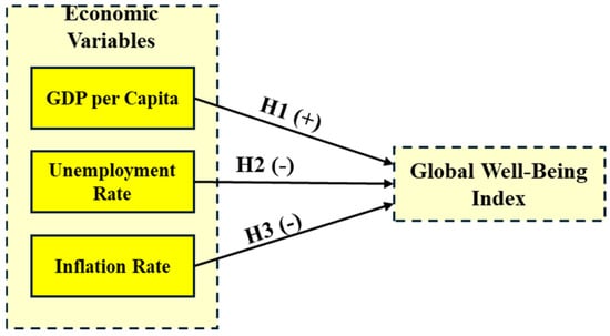 The negative relationship between unemployment and well-being is strongly supported in the literature [18,21,22,31,32]. The magnitude of this effect is major, with studies indicating that the negative impact of unemployment is approximately 2.5 to 5 times stronger than that of inflation [31,32]. Welsch and Kühling [18] point out that unemployment exacerbates the negative impact of GDP decline on well-being. However, Rasiah et al. [19] point out contradictions, with some OECD countries showing a positive relationship, suggesting potential contextual factors that are worth considering. From the literature review, it is established that the unemployment rate negatively influences the Global Well-Being Index (H2).