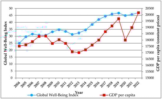 Index of GDP per capita and Global Well-Being Index in Portugal (2004–2022). Source: Author’s own calculations using data from PORDATA.