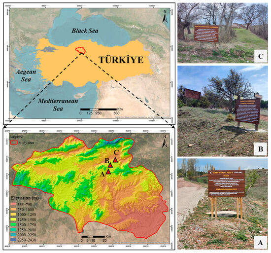 The study was carried out in İstiklal Yolu Historical National Park, located within the borders of Çankırı province, between the Kızılırmak and Western Black Sea main basins in the north of the Central Anatolia Region of Türkiye (Figure 1). The national park consists of 11 sections: the Çankırı Section (comprising three separate parts), the Kastamonu Section, the Seydiler Section, the Küre Section (comprising five separate parts), and the İnebolu Section. The Çankırı section of the national park begins at the Aşağı-Yukarı Çavuş village junction, approximately 13.5 km north of Çankırı city center, and ends at the Kıyısın village junction, located about 40 km from the city center. In 2013, this route was officially registered as a historical site and was named the Historic Independence Road. The Historic Independence Road consists of three stages: the first stage is the climbing section of the Indağı slope, which is approximately 7.5 km and includes dirt and asphalt roads; the second stage is the section with historical landmarks, which spans 16.5 km and consists of dirt and stone roads; and the third stage is the village road section, covering 8.5 km of asphalt roads. The section with historical landmarks was selected as the study area, as it is the part of the Historic Independence Road that best reflects its historical character with its rural landscape, traditional roads, fountains, inns, and former police stations. Furthermore, this section was preferred because it is closed to vehicular traffic and contains no asphalt roads, offering maximum safety and health benefits for participants.