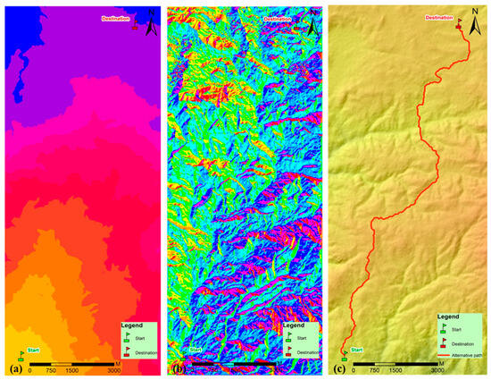 Before initiating the LCPA processing steps, a slope map (in degrees) was generated from the ALOS-PALSAR DEM data. Slope is one of the most critical factors used to determine the level of difficulty for hiking routes [31,32], as increasing terrain slope directly leads to higher energy expenditure for hikers. In this study, the slope data were derived from a high-resolution DEM, and the cost values were calculated using a standard transformation method, where steeper slopes were assigned higher cost values. This approach reflects the increasing difficulty and energy demand associated with steeper terrain. While slope is a widely used and effective criterion in least-cost path modeling for hiking route identification, it is acknowledged that other variables, such as vegetation, soil type, existing access points, land cover type, accessibility to transportation infrastructure, and ecological sensitivity, could further refine the analysis. The exclusion of these variables in the current study was primarily due to data availability and the aim to maintain methodological simplicity. Therefore, considering the slope factor is essential when selecting suitable hiking routes. In a study conducted by Choi et al. [33] in a forest area with varying difficulty levels, it was found that participants exhibited elevated heart rates and increased energy consumption in challenging uphill segments. Following this, the least-cost hiking route was identified using slope data within the LCPA framework for the study area, where the starting and ending points had been previously defined. This route was determined through a three-stage LCPA process (Figure 5 and Figure 6).