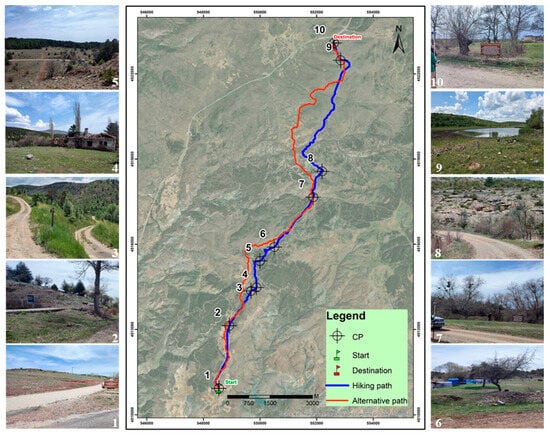 A total of ten points, including eight significant locations as well as the starting and ending points, were identified within the scope of hiking for the historical points section of the Historic Independence Road in the study area (Figure 4). Trekking activities in this area are generally initiated from CP-10. However, in this study, CP-1 was selected as the starting point. This point was considered more suitable for hiking purposes, particularly due to its dirt road surface.