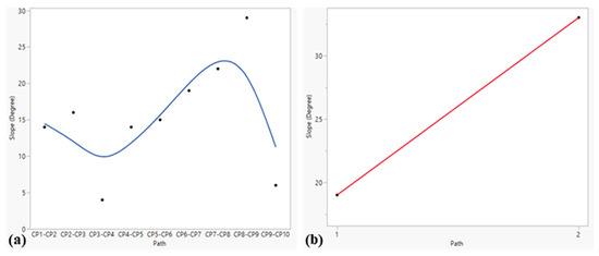(a) Average slope for the existing hiking route; (b) Average slope for the segments of the trekking route.