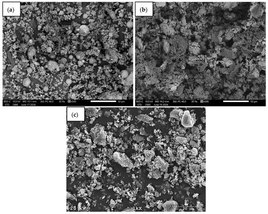 To fully characterise the base materials used, their chemical composition was analysed by X-ray fluorescence (XRF) using a SHIMADZU EDX-7200 spectrometer (SHIMADZU Europa GmbH, Duisburg, Germany). The results of the analysis are summarised in Table 1. Data on the chemical composition of chalcedonite were obtained from information provided by the manufacturer [55]. On the other hand, the microstructure of selected waste raw materials is shown in Figure 1 to better illustrate their potential as functional components in the structure of geopolymer foams. The photo was taken with a JEOL IT200 scanning electron microscope, and the chalcedonite photos were taken with a JEOL JSM-5510LV (JEOL Ltd., Akishima, Tokyo, Japan) [55].