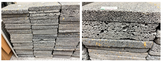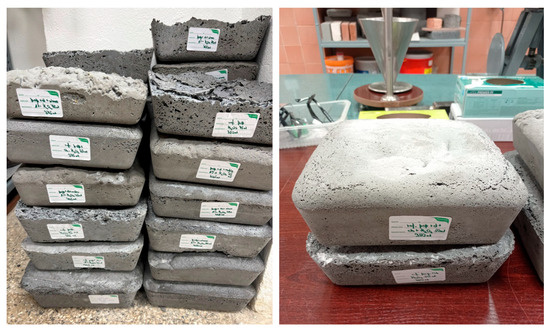 Figure 2 displays the appearance of foamed geopolymer samples immediately after demoulding, that is, in the raw state without further processing. The characteristic features of the material’s surface after the annealing process, such as irregularities, air bubbles, and the natural porous structure of the foams, are visible. Figure 3 shows the same types of specimens after mechanical processing, which involved precisely cutting them to the required dimensions. These prepared samples were intended for further laboratory tests, particularly measurements of thermal properties. The machining aimed to standardise the geometry of the samples and ensure proper contact with the measuring plates of the device used to analyse thermal insulation properties.