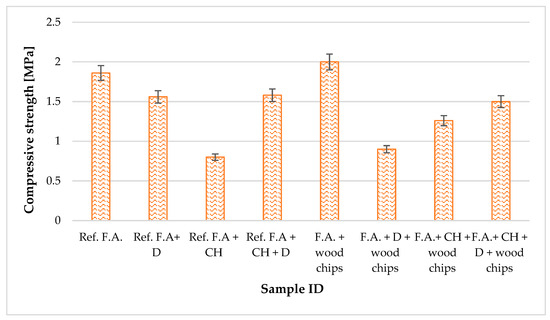 Based on the data presented in Table 3 and Figure 4, a clear difference in the compressive strength of individual mixtures can be observed. Ref. F.A. sample achieved a strength of 1.86 MPa, which is the reference point for the other variants. The highest value was obtained for the sample containing fly ash with the addition of wood wool (F.A. + WW). The introduction of other additives—diatomite, chalcedonite, and their combinations—without wood wool generally had a negative effect on compressive strength, particularly in the case of chalcedonite alone. Meanwhile, for diatomite alone and for the diatomite–chalcedonite combination, the strength values were similar to each other and not as markedly reduced compared to the reference as in the FA + CH sample. Importantly, the inclusion of wood wool in this mixture significantly improved its mechanical properties. The opposite effect was observed for the F.A. + D + WW composition, where a decrease in strength was recorded compared to the material with diatomite alone. The addition of wood wool generally had a positive effect on the compressive strength of the tested mixtures. However, the effect of individual components is neither linear nor unambiguous, which underscores the need for further research into their mutual interactions.