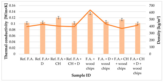 The graph showing the dependence of the thermal conductivity coefficient on the volume density of the tested samples (Figure 5) demonstrates a clear correlation between the two parameters. As the density of the foamed composites increases, there is a tendency for the value of the thermal conductivity coefficient to increase. This means that samples with lower density, and therefore more porous, have better insulating properties. This is consistent with the mechanism of heat conduction in porous materials, where a greater amount of enclosed air (with very low thermal conductivity) in the structure effectively limits the transport of thermal energy. On the other hand, the higher density of the samples, resulting from a smaller number of pores or their poorer distribution, is associated with a higher proportion of the solid phase, which has a higher thermal conductivity than air, leading to an increase in λ. Of the samples analysed, those containing wood wool additives in combination with chalcedonite and/or diatomite allowed the lowest density and thermal conductivity values, confirming the favourable effect of the combination of texture and lightweight additives. On the other hand, the sample containing only fly ash and wood wool (without mineral additives) had the highest density and the highest thermal conductivity coefficient, indicating that the use of wood filler alone is not sufficient to provide an effective porous structure.
