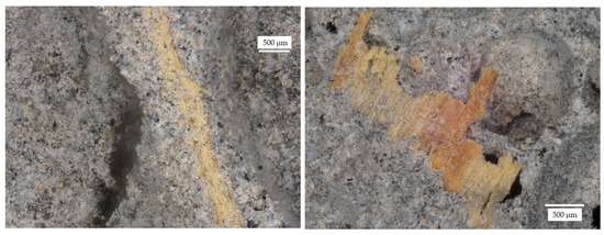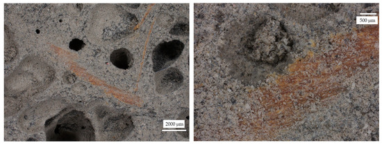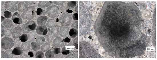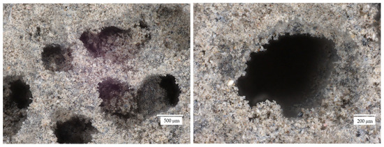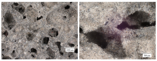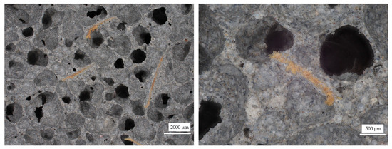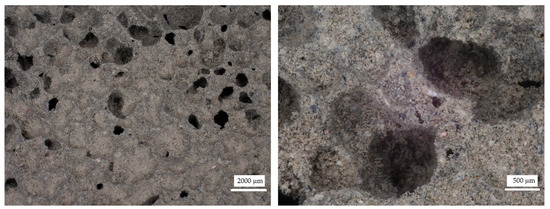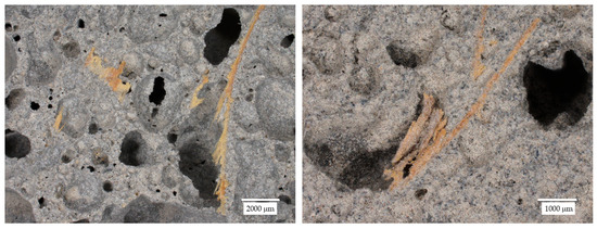Figure 6, Figure 7, Figure 8, Figure 9, Figure 10, Figure 11, Figure 12 and Figure 13 show the microstructure of all the prepared foamed geopolymer samples. The images were captured using a digital optical microscope at various magnification levels, allowing for a detailed examination of the internal porous structure of the materials. Varying the magnification scale made it possible to capture both the general arrangement of the pores and the phase distribution of the components, as well as finer details such as the morphology of the pore walls, the presence of wood wool, or the nature of the mineral additives.