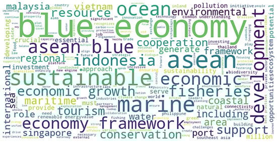 Once the dataset has been defined by themes related to Indonesia’s diplomatic strategy in the ASEAN, its patterns of repetitive keywords are then identified in pinpointing narratives that Indonesia often uses in advancing regional dialog. All speeches relevant to themes of blue economy inclusion were used in the thematic analysis to identify patterns in discourse and policy framing. Through an analysis of significant speeches, we demonstrates how Indonesia promotes itself as a driver for economic cooperation, strategic regional influence, and ocean governance. The themes highlight the unifying role of the sea and the necessity of collaboration for sustainable regional growth. Table 1 will show a thorough summary of Widodo’s speech, displaying key phrases that are often mentioned in his speech, while Figure 1 contains a word cloud visualization of remarks from the ABEF speakers. To note, word cloud visualization depicts keywords in which the dimension of each word corresponds to the frequency with which it appears throughout the dataset. For reference, the Supplementary File contains the entire dataset, which includes a thorough classification of thematic components.
