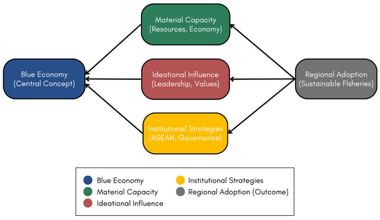 The dynamic of the three main elements of materiality, ideas, and institutions reinforces the consent-based power of hegemony theory. Materiality can be seen as a tangible component of a country’s resources, as in Indonesia’s economic and resource-based leadership in the blue economy. Material power is subsequently transformed into a consensual and a cooperative system, with ideological approaches rooted in the shared values of interest, including the narratives Indonesia promotes in the ASEAN. To formalize the hegemon’s leadership, therefore, institutions came into play in creating a mechanism to ensure that shared values are practiced and decisions are reached with consent, through which Indonesia integrates the blue economy policies within the ASEAN frameworks [28]. As seen in Figure 2 below, in order to establish a dominant position toward embracing sustainable fisheries as a vital part of the regional blue economy, the three factors cooperate.