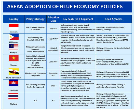 - Wiradji, S. Blue economy bodes well for ASEAN. The Jakarta Post. 5 July 2023. Available online: https://www.thejakartapost.com/business/2023/07/05/blue-economy-bodes-well-for-asean.html (accessed on 13 January 2025).