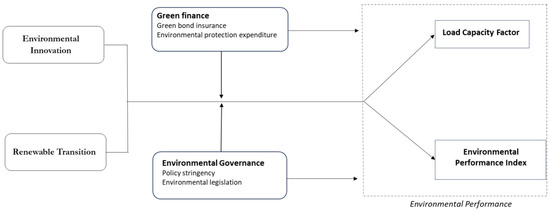 The pursuit of improved environmental performance has gained momentum with the growing recognition of climate change risks, environmental degradation, and the limitations of conventional financing mechanisms. Within this context, green finance—defined as the provision of financial services for investments that deliver environmental benefits—has emerged as a pivotal mechanism for directing capital flows toward sustainable technological transformation. It acts as a catalyst in promoting both environmental innovation and renewable energy deployment, which are key levers for enhancing environmental performance. Green finance mechanisms such as green bonds, concessional loans, and sustainability-linked investments provide the financial resources needed to support the high upfront costs often associated with eco-innovations and clean energy projects. According to Xiong and Dai [31], green finance not only mobilizes funds but also creates favorable economic conditions that stimulate investment in sustainable technologies. Similarly, Dong et al. [32] emphasize that green financial systems reduce investment risk and improve capital access for environmentally oriented firms. In this way, green finance supports theoretical arguments from Endogenous Growth Theory, which posits that capital allocation shapes innovation-led growth, and Ecological Modernization Theory, which emphasizes the importance of institutional and financial modernization as essential components of sustainable development. The provision of targeted environmental finance not only accelerates the production and adoption of cleaner technologies but also incentivizes long-term market behavior aligned with environmental performance improvements.