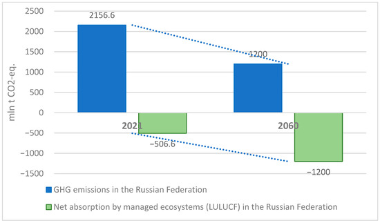 According to the 2015 Paris Agreement [1], all its parties must formulate and submit to the secretariat of the United Nations Framework Convention on Climate Change (UNFCCC) regarding long-term development strategies for low greenhouse gas emissions for the period up to 2050 by 2020. By November 2024, 74 countries had fulfilled this condition [2]. Russia began developing the Long-term low-emission Development Strategy of Russia (LT LEDS) in 2019, and on 29 October 2021, it was approved by the Government of the Russian Federation [3]. The LT-LEDS is a crucial framework that guides countries in aligning their developmental goals with the Paris Agreement’s objective to limit global warming to well below 2 °C. These strategies provide a roadmap for transitioning national economies towards sustainable, low-carbon models by the mid-century, integrating climate action with economic and social planning. LT-LEDS includes the strategies in the LULUCF sector aimed at reducing emissions and increasing absorption by ecosystems.