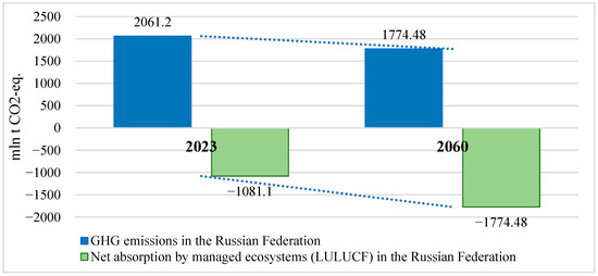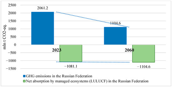 It is known that reducing GHG emissions through technology is quite an expensive measure. In general, approaches related to the implementation of nature-based climate projects are more economically attractive. The role of managed forests in net carbon sequestration in LULUCF is around 90%, as per NID 2024. Non-managed forests also absorb CO2 from the atmosphere. Romanovskaya and Korotkov [20,53] estimate that 80% of net absorption by managed and non-managed ecosystems is performed by forests.