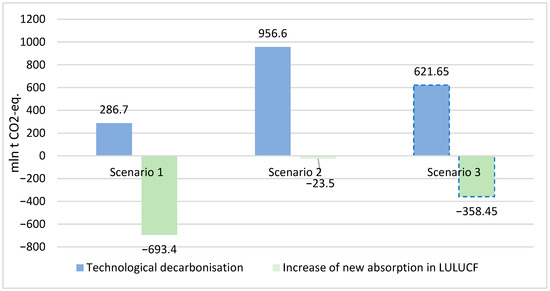 Scenario 1. In this scenario, the increase in net absorption in LULUCF will remain as planned in LT LEDS 2021, at 693.4 Mln t CO2-eq., while technological decarbonization will decrease from 956.6 to 286.7 Mln t CO2-eq (2061.2-1081.1-693.4), or by almost 2.8 times compared to the LT LEDS 2021 decarbonization target (Figure 2).