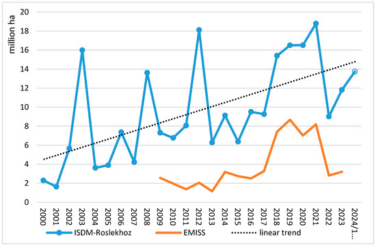 Dynamics of forest fires in Russia according to the Forest Fires Information System of Remote Monitoring of the Federal Forestry Agency (ISDM-Rosleskhoz) and Unified Interdepartmental Information and Statistical System (EMISS) in 2000–2024.