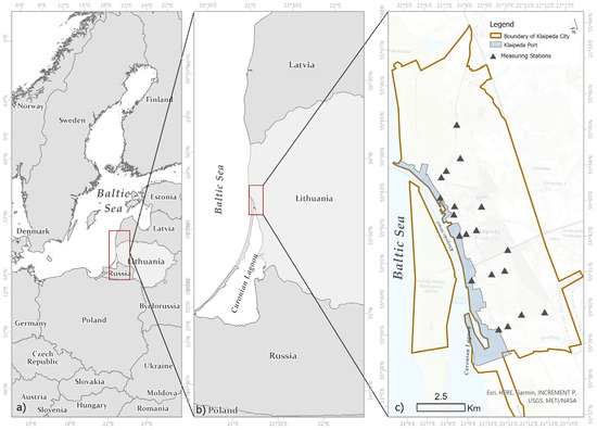 The primary study area is Klaipėda (54°43′16″ N, 21°07′ E), Lithuania’s third-largest city and principal seaport, located on the southeastern Baltic Sea coast. Klaipėda’s distinctive urban structure—combining industrial, port, and residential zones within a compact area of approximately 98 km2 and a population of around 166,000—creates a complex environmental landscape. The Port of Klaipėda, located adjacent to the city center, handles significant maritime traffic, contributing notably to local air pollution.