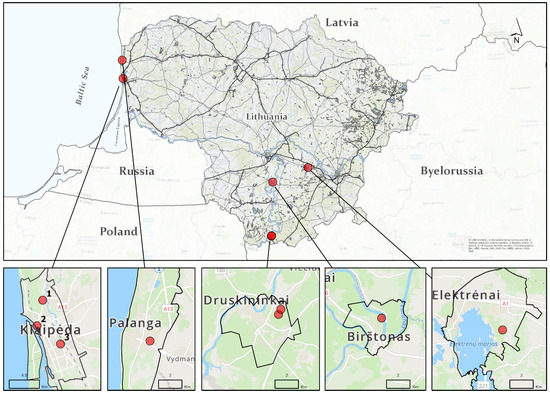 Building upon the 2023 campaign depicted in Figure 1, Figure 2 presents an expanded spatial and temporal framework introduced in 2024. This new phase of data collection extended the study beyond Klaipėda to include selected Lithuanian resort and therapeutic towns—Palanga, Birštonas, Druskininkai (two sites), and Abromiškės. This expansion aimed to investigate nitrogen dioxide (NO2) concentrations across functionally and environmentally distinct settings.
