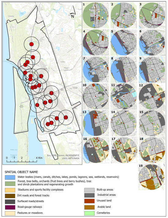 Figure 3 illustrates the spatial layout of all 19 NO2 sampling sites across Klaipėda’s urban area, along with their surrounding buffer zones. The central map displays site locations overlaid on the city’s base map, while the adjacent inset maps depict detailed land use structure within each buffer. These insets reflect the proportion and spatial arrangement of various land cover types—such as built-up areas, transport corridors, industrial zones, and green spaces. Although some buffer zones partially overlap due to the uniform 1 km2 area defined around each site, each buffer is analyzed independently. This means that the same spatial objects, such as streets or corridors, may contribute to more than one site’s index calculation if they fall within multiple buffers. This approach ensures methodological consistency and allows local morphological differences—such as the presence of forests in one buffer but not another—to be fully captured.