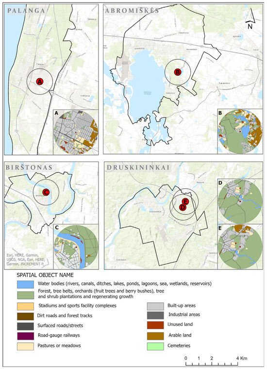 In this study, land use classification for each sampling site was based on official national GIS datasets, providing spatially encoded feature codes and delineated land cover types. Cadastre data and information are collected and stored by the state using the Lithuanian coordinate system, LKS-94, and in the Lithuanian state altitude system, LAS07. To ensure consistency across all locations, the analysis included only the principal land use categories that demonstrated substantial coverage within the defined buffers. These dominant classes were consistently observed across all 24 sites—19 in Klaipėda and 5 in resort towns—and are presented in Table 1, together with their corresponding GIS feature codes.