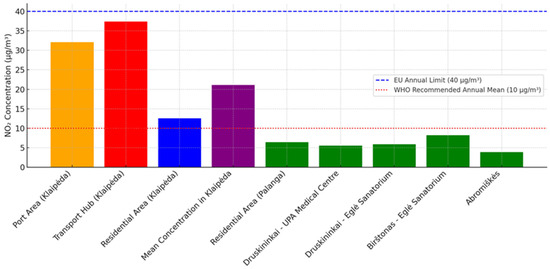 This study compared NO2 concentration levels measured during the summer of 2024 in Klaipėda city and Lithuania’s major resort areas. The results revealed significant differences (Figure 5). In resort areas, NO2 levels were as follows: Druskininkai (UPA Medical Centre—5.56 µg/m3), “Eglė” Sanatorium in Druskininkai—5.92 µg/m3, “Eglė” Sanatorium in Birštonas—8.20 µg/m3, Abromiškės Rehabilitation Centre—3.88 µg/m3, and Palanga (residential area)—6.44 µg/m3. In Klaipėda, NO2 concentrations were substantially higher at key urban sites: Port Area—32.09 µg/m3, Transport Hub—37.34 µg/m3, and Residential Area—12.55 µg/m3. All values represent mean concentrations measured during the two-week summer campaign in August 2024, corresponding to the average over the entire measurement period.